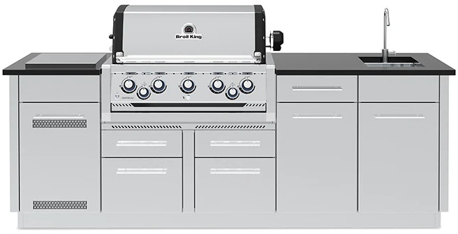 The Broil King® Imperial™ S 590i series features 625 sq. in. of primary cooking surface and includes 5 stainless steel Dual-Tube™ burners, built-in oven lights, illuminated control knobs, 5 professional cast stainless steel cooking grids, stainless steel warming rack, stainless steel Flav-R-Wave™ cooking system, and electronic ignition. The S 590i features 304 stainless steel utility cabinet drawers with a tank holder (LP). Granite countertop, stainless sink and faucet not included.Read More