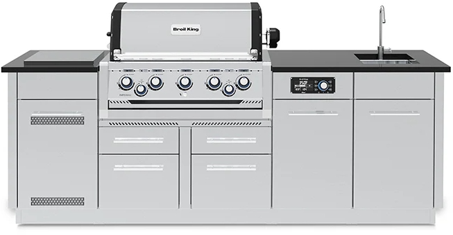 The Broil King® Imperial™ QS 590i series features 625 sq. in. of primary cooking surface and includes 5 stainless steel Dual-Tube™ burners, iQue burner control in the main cookbox, built-in oven lights, illuminated control knobs, 5 professional cast stainless steel cooking grids, stainless steel warming rack, stainless steel Flav-R-Wave™ cooking system, and electronic ignition. The QS 590i features 304 stainless steel utility cabinet drawers with a tank holder (LP). Granite counter top, stainless sink and faucet not included.Read More