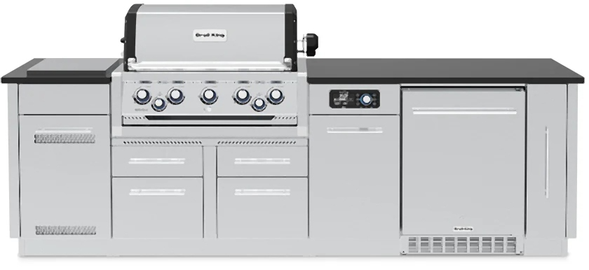 The Broil King® Imperial™ QS 590i series features 625 sq. in. of primary cooking surface and includes 5 stainless steel Dual-Tube™ burners, iQue burner control in the main cookbox, built-in oven lights, illuminated control knobs, 5 professional cast stainless steel cooking grids, stainless steel warming rack, stainless steel Flav-R-Wave™ cooking system, and electronic ignition. The QS 590i features 304 stainless steel utility cabinet drawers with a tank holder (LP). Granite counter top, stainless sink and faucet not included.Read More