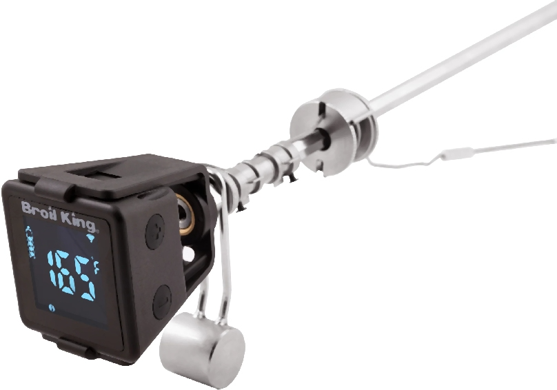 Wi-Fi/ Bluetooth enabled rotisserie thermometer connects to Broil King iQue app.