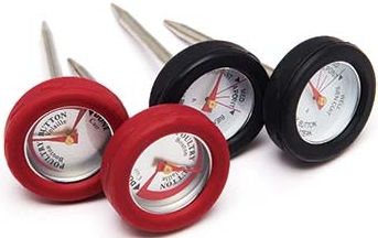A 4 pack of mini meat thermometers with silicone bezel for easy removal from cooked foods and individual cuts of meat. 2 pieces calibrated for poultry in red and 2 calibrated for steak in black. Comes with a convenient Broil King® branded stand to keep the thermometers organized.Read More