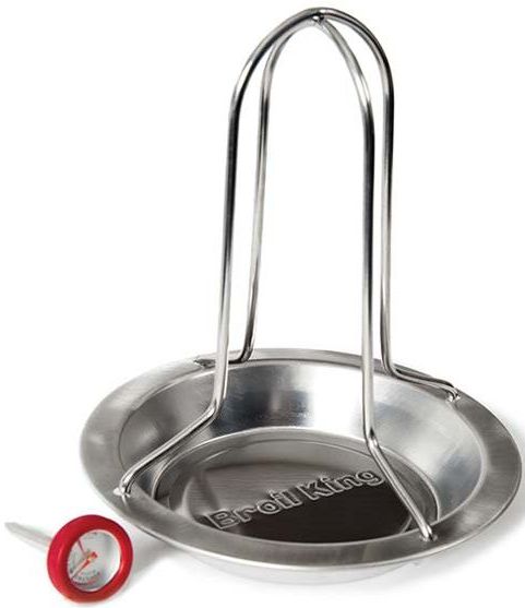 The best way to roast poultry on your grill! Includes one set of stainless steel supports that can accommodate most chickens and secure the beverage can; also features a Broil King® embossed stainless steel pan. Silicone bezel thermometer included.