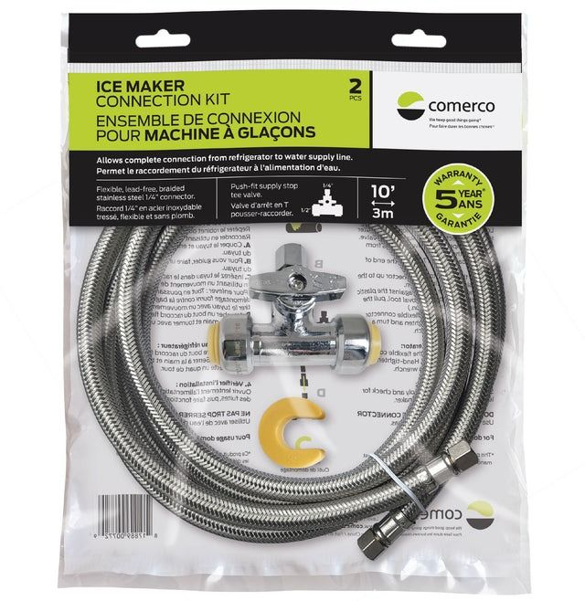 Comerco premium Ice Maker Connector Kit is the perfect solution for easy and reliable refrigerator water connection. This kit includes a 10' (3 m) braided stainless steel ¼ connector, a secure and leak-proof push-to-connect T-shutoff valve (1/4" to 1/2"), and a removal tool. Made with quality materials, such as flexible braided stainless steel and a PVC center, this connector kit ensures durability and longevity. It is lead-free, providing peace of mind for your family's health and safety. With UPC, NSF, and ANSI 61 certification, you can trust the quality and performance of this ice maker connector kit. Enjoy hassle-free installation and trouble-free operation with this premium connector kit.
