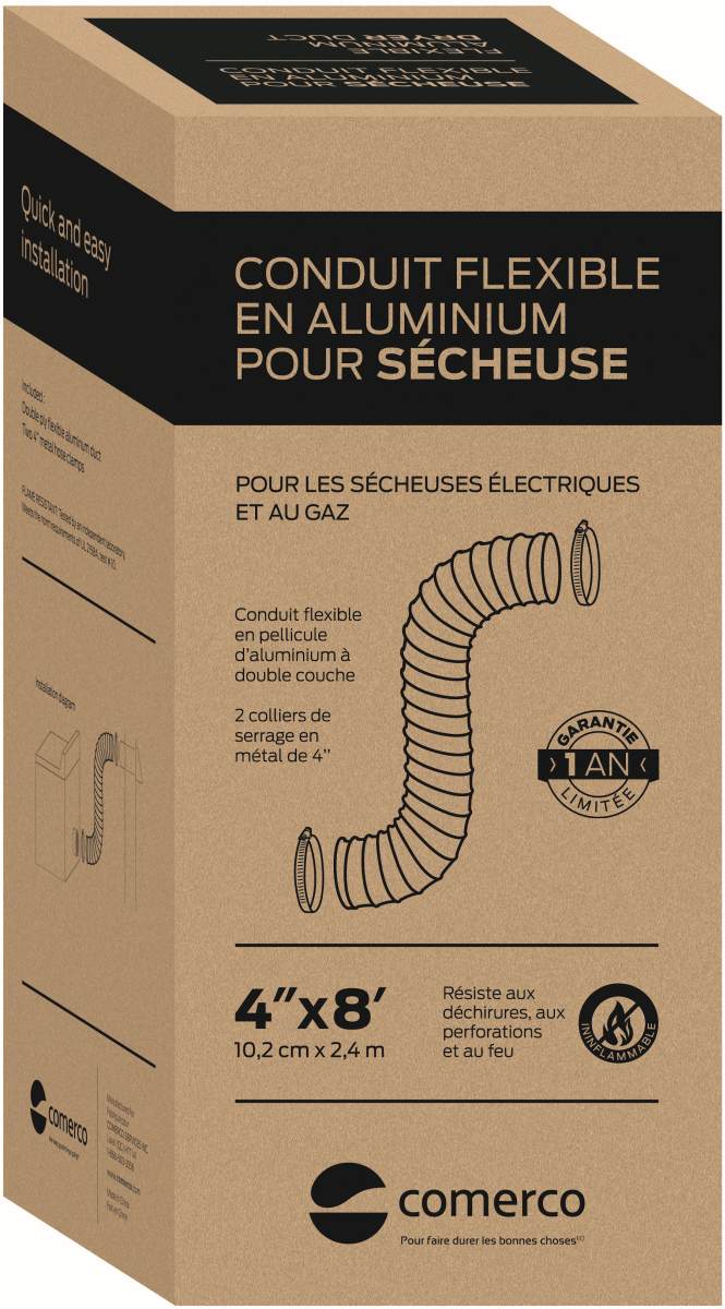 This double ply flexible aluminum duct, resistant to tearing, perforations and fire, can be used with gas and electric dryers.The installation is versatile and simple with gas and electric dryers.Read More