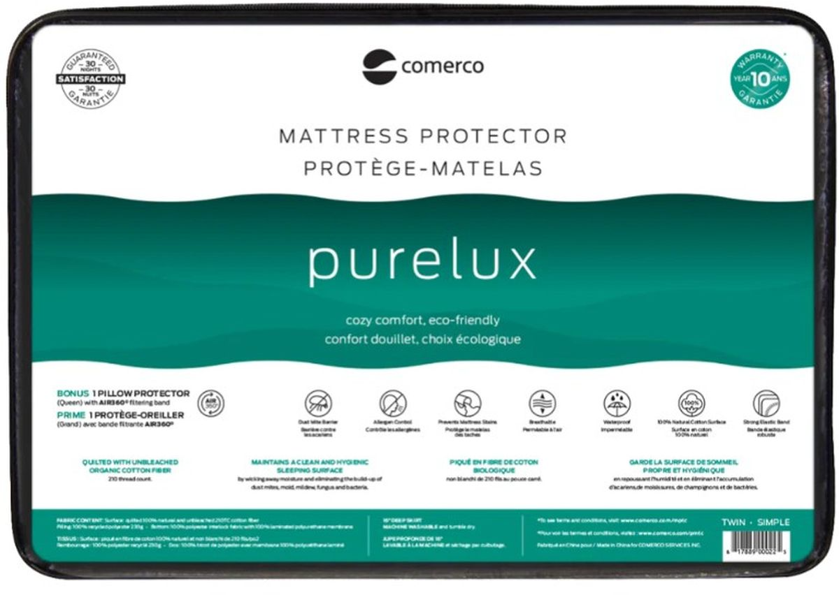 Enjoy exceptional sleep quality with the COMERCO Purelux Mattress Protector! Combining cozy comfort and an eco-friendly choice, this mattress protector is 100% waterproof yet breathable. Made with 100% natural cotton, this mattress protector is the ultimate eco-friendly choice. For complete protection, this set also includes one pillow protectors featuring Air360° technology. With a generously cushioned surface and a 10-year stain guarantee, you can sleep peacefully knowing your mattress and comfort are well protected.