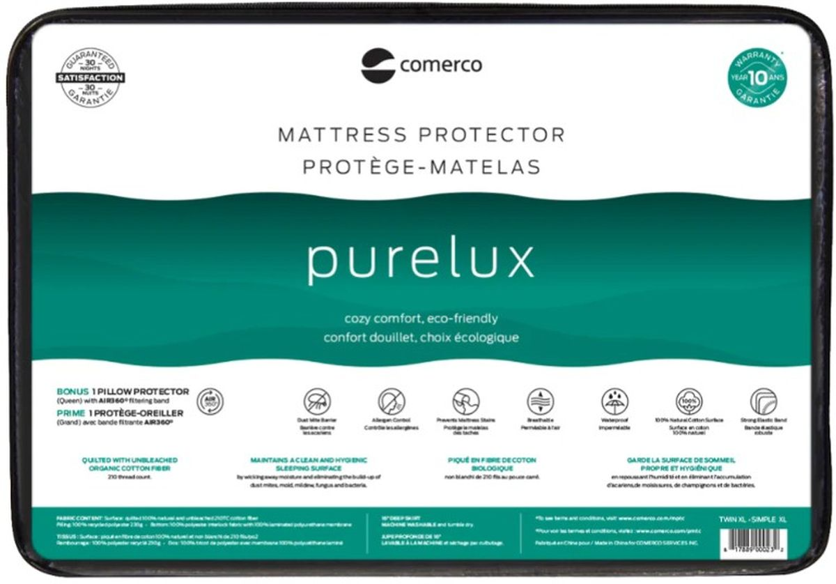 Enjoy exceptional sleep quality with the COMERCO Purelux Mattress Protector! Combining cozy comfort and an eco-friendly choice, this mattress protector is 100% waterproof yet breathable. Made with 100% natural cotton, this mattress protector is the ultimate eco-friendly choice. For complete protection, this set also includes two pillow protectors featuring Air360° technology. With a generously cushioned surface and a 10-year stain guarantee, you can sleep peacefully knowing your mattress and comfort are well protected.