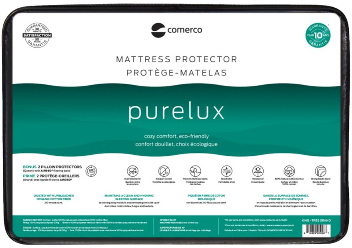 Enjoy exceptional sleep quality with the COMERCO Purelux Mattress Protector! Combining cozy comfort and an eco-friendly choice, this mattress protector is 100% waterproof yet breathable. Made with 100% natural cotton, this mattress protector is the ultimate eco-friendly choice. For complete protection, this set also includes two pillow protectors featuring Air360° technology. With a generously cushioned surface and a 10-year stain guarantee, you can sleep peacefully knowing your mattress and comfort are well protected.