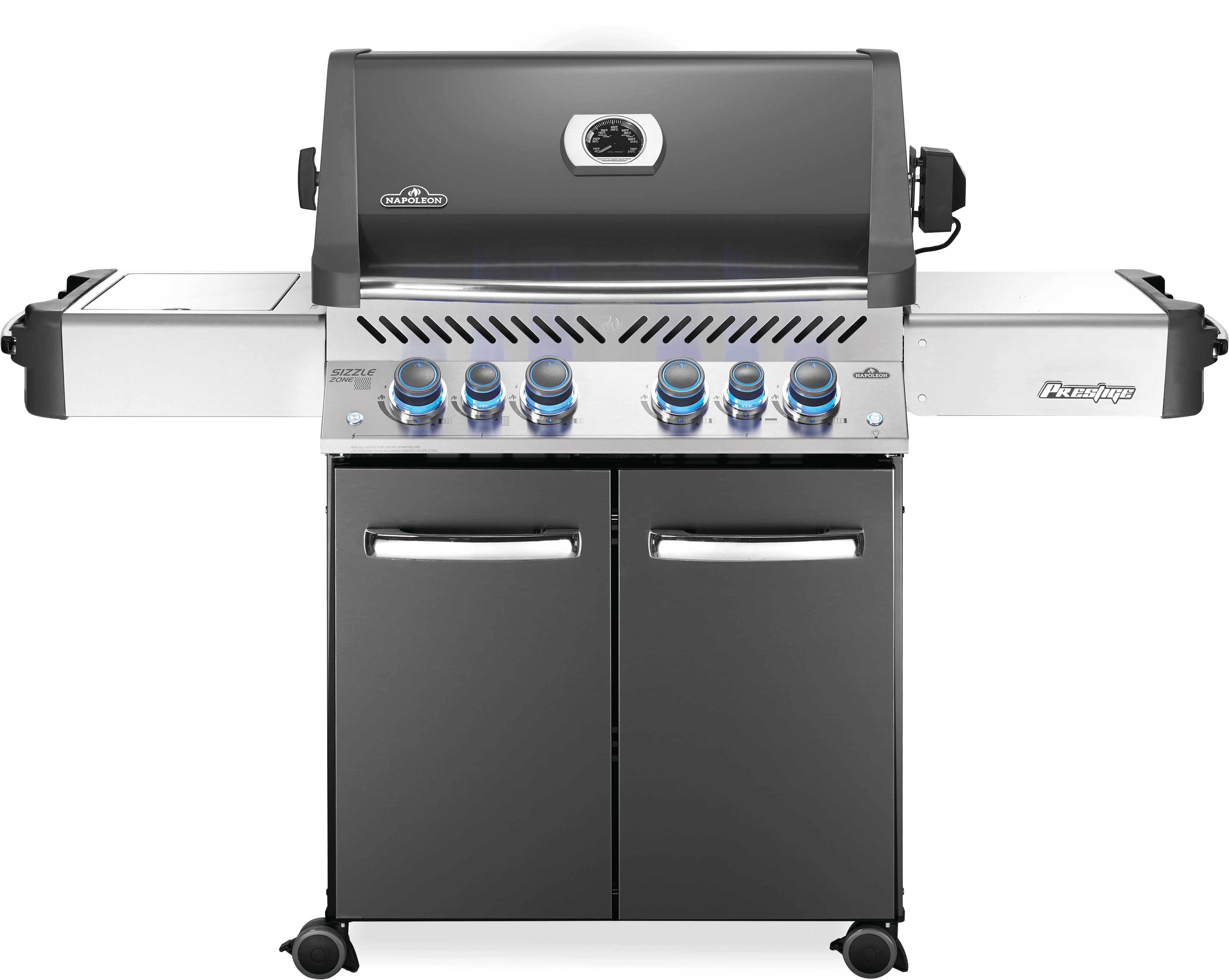 The Napoleon Prestige® 500 Natural Gas Grill with Infrared Side and Rear Burners is the total grilling package; with a stunning porcelain enamel grey hood and stainless steel construction, this cart model has the capabilities of a full outdoor kitchen. With four main burners, an infrared rear and side burner, this grill can cook meals using eight unique cooking styles. Grill for a crowd with a capacity for up to thirty hamburgers, and up to eight more on the side burner. You'll know it's a Napoleon with the Iconic WAVE™ cooking grids for those distinctive sear marks. Not just durable on the outside; under the lid, is the same quality stainless steel used for the basin, tube burners, dual-level sear plates, and cooking grids. Seven stainless steel sear plates provide extra surface area for any drippings from your food to vaporize, avoiding flare-ups. Never leave your barbecue on again as all the Prestige® series grills come with the SafetyGlow Feature where the control knobs glow red when the burner is on.Read More