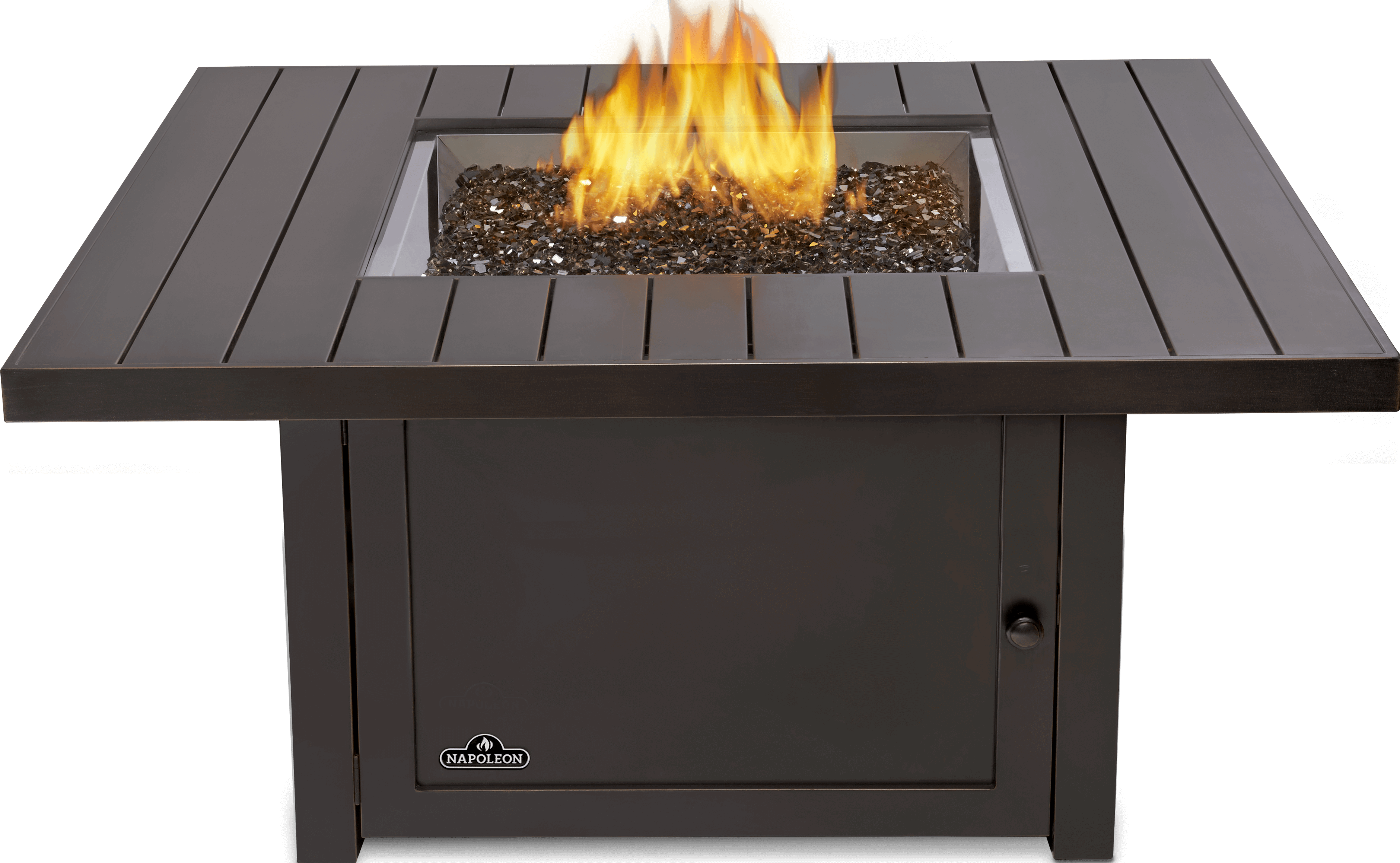 This is the focal point of your relaxation area. The Napoleon St. Tropez Square Patioflame® Table boasts a design that is both elegant and modern, it will match any decor. Finished in rustic bronze and paired with a glass ember bed, provides for a stunning look. It even comes with an aluminum burner cover to turn it into a full table when you're not watching those beautiful flames. Easily light the Square Patioflame® Table and receive 60,000 BTU's of heat, dancing flames, and glittering light for your outdoor space. No need to worry about unsightly fuel lines and tanks cluttering your space. The St. Tropez Patioflame® Table hides the propane tank behind an easy access door.Read More