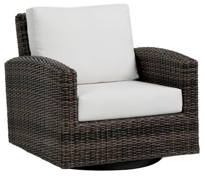 Featuring a Mediterranean design, the Coral Gables swivel gliding club chair displays rounded armrests, weaved resin on an aluminum frame and plush seat and back cushions. Fabric choices available.Read More
