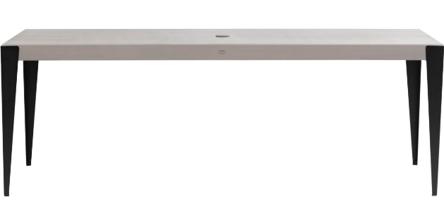 The Genval rectangular dining table features black aluminum legs with a durable faux concrete aluminum top for a sleek and casual look. It comes with a pre-drilled umbrella hole for added convenience. The table can sit up to 10 people.Read More