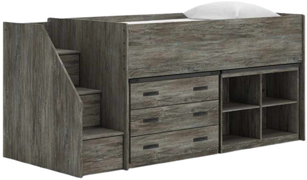 Includes loft bed, left storage steps with loft ends, roll slats, loft bookcase and loft drawer storage