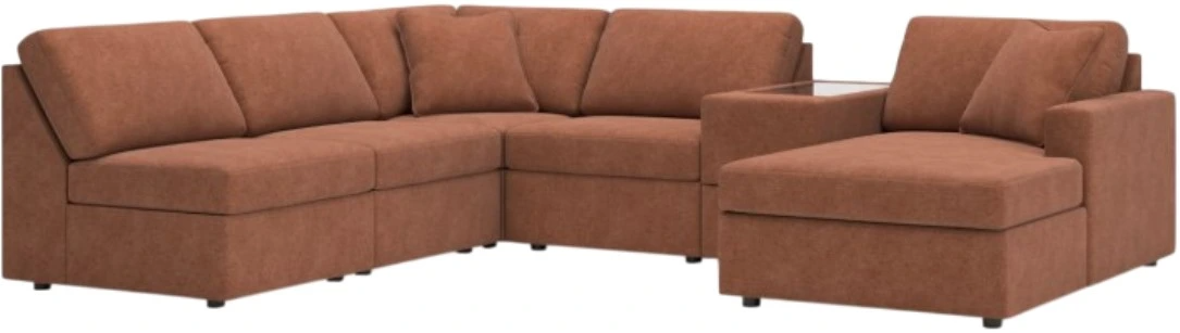 Includes 6 Modular Pieces: Right-arm facing corner chaise, 3 armless chairs, console with storage and wedge