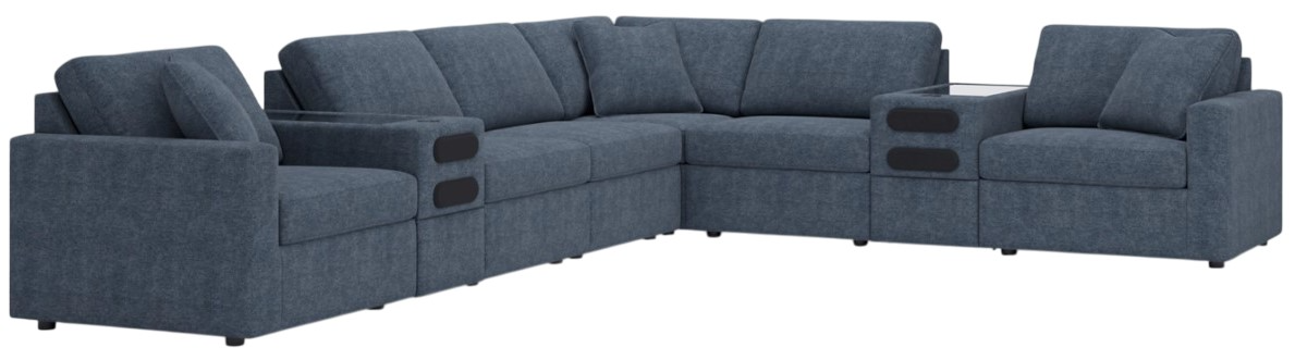 Includes 8 Modular Pieces: Left-arm facing corner chair, 3 armless chairs, wedge, 2 audio consoles with storage and right-arm facing corner chair