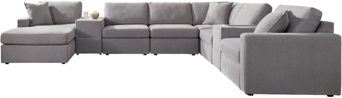 Includes 8 Modular Pieces: Left-arm facing corner chaise, 3 armless chairs, 2 consoles with storage, wedge and right-arm facing corner chair